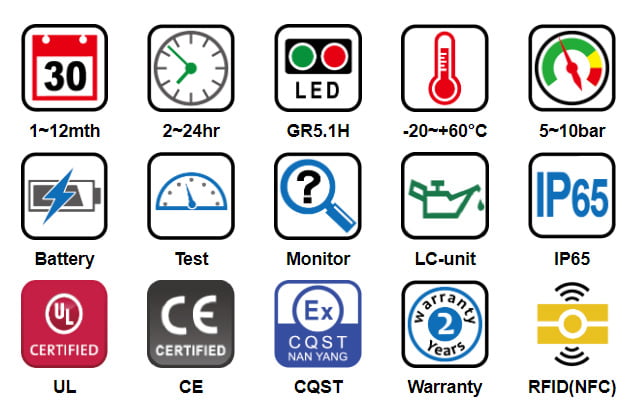 Easylube® RFID (version GR 5.1 H) model is equipped with electromechanical gear set, Bicolor LED warning light, RFID tag and reader to enable real time tracking of bearing to achieve condition-based maintenance.